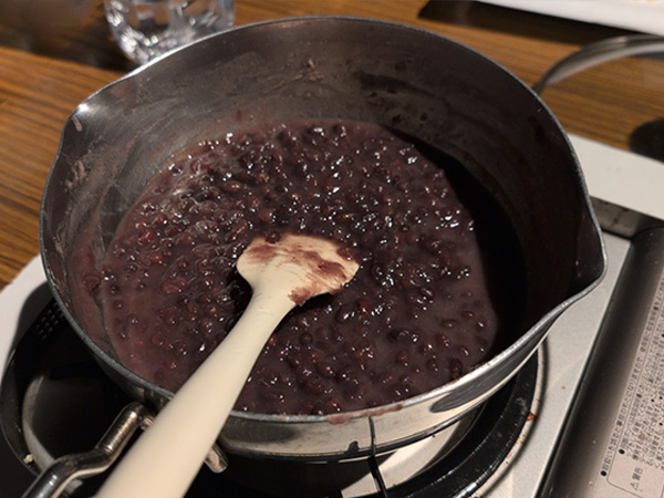 こうすることでぜんざいの粘りが強まり、水分を閉じ込めることができます。