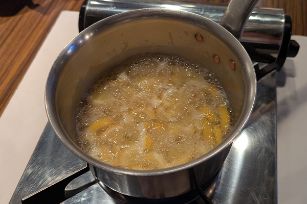 なのでレモンを丸ごと2個、レモン果汁を50g加えます。ざく切りにしたレモンと絞った果汁、水を鍋に入れてやわらかくなるまで煮ます。