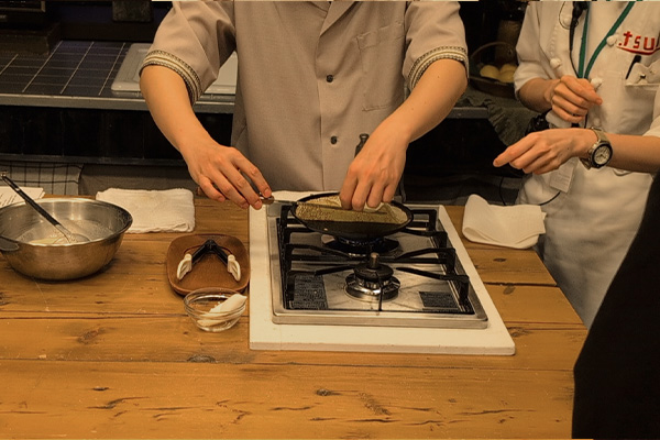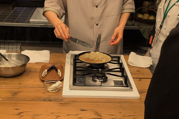 ふきんから持ち上げて空中でフライパンを回しながら生地を薄く均一に流して焼いていきます。