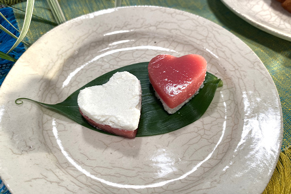 仕上げに、先ほどつくったゴイアバーダとチーズはハートの型でくり抜いて重ね合わせます。