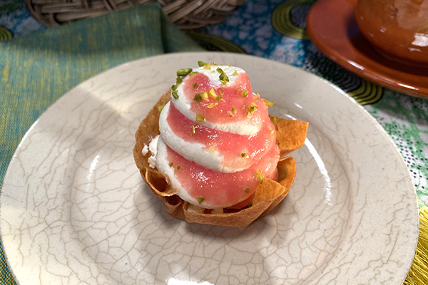 春巻きの皮でつくった器にはさいの目にしたゴイアバーダとチーズをバランスよく入れます。
