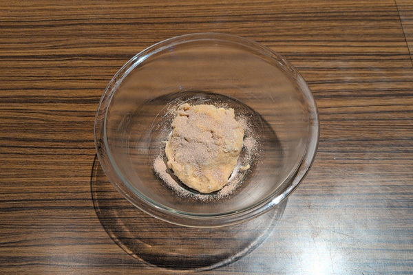 ドライイーストを振りかけて、ラップをしたら冷蔵庫で30分休ませます。
