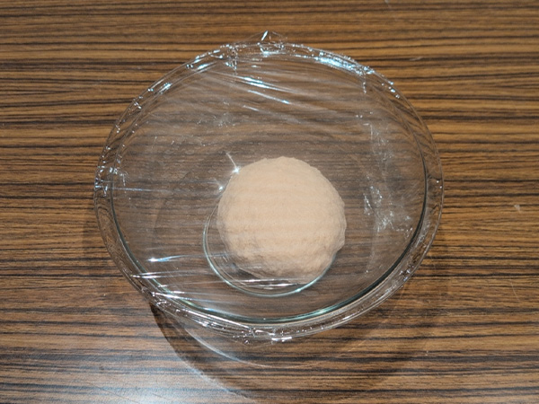 生地がまとまり、ツルっとした表面になればボウルに移してラップをかけ、22~28℃で60分発酵させます。