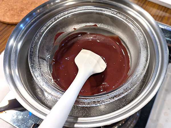 その後、冷水の入ったボウルに溶かしたチョコレートを当てて27℃になるまで冷やし、