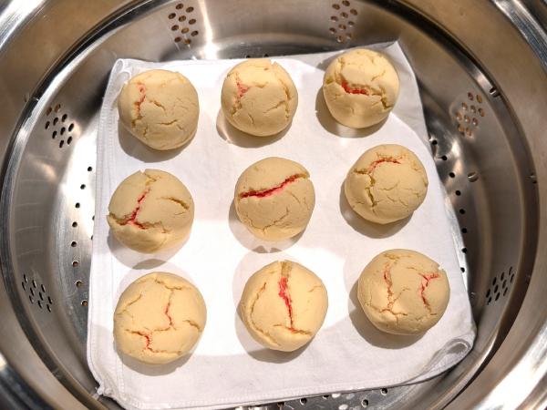 黄味餡の表面が割れて、稲妻のように見える仕上がりが正解! 亀裂から、赤く色づけた黄味餡が覗き見えるのが大切です。中心には小豆餡。黄色の餡・赤い餡・黒い餡の3種類を用意するのは一見大変ですが、ベースは同じなので案外作りやすいかも。蒸しているうちに自然と割れ目が生まれてくるので、「ちょうどいい亀裂」が入ることを祈りながら待つのも楽しみのひとつです。