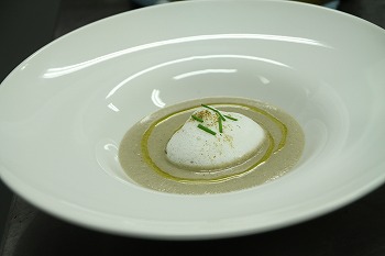 江崎は、新鮮なポルチーニの代わりにポルチーニパウダーを使ってスープを作りました。