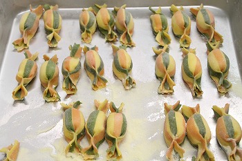人参と、ほうれん草で色づけしたパスタを、普通に伸ばした生地の上に細く切ってならべ、さらにまた伸ばす。