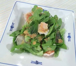 6. サラノバレタス、エビ、ササミを器に盛り、マスタードソースをかける。
