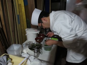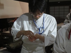 この料理をセットの片隅で慎重に仕上げる毛利先生