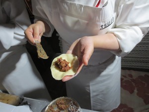 中国料理の先生に習った方法で集中して肉まんを包む伊藤先生と渡邊先生