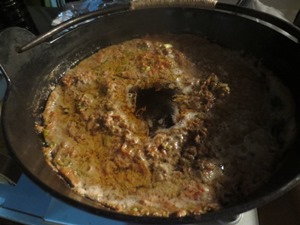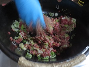 「まずは原液としての鴨挽肉、ネギ、人参と卵白をよく練った物に水を加えております」