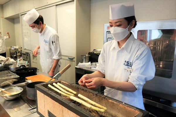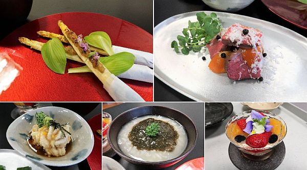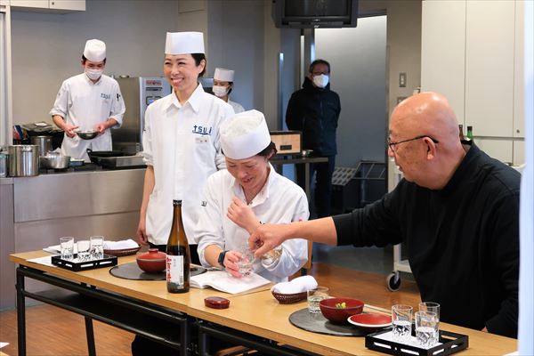 お料理は、雲子(白子)の揚げだしに始まり、ホワイトアスパラガスにほろ苦いふきのとう味噌を合わせた田楽を。そのあとは、合わせるお酒を変えて、鴨の炙り、親不知もずく雑炊でしめました。最後は、日本酒をしっかり利かせたゼリーですっきりと。冬から春への移り変わりを感じさせるお料理で、「糸魚川の酒」を存分に楽しみました。