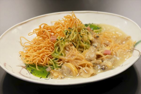 新玉ねぎで作った緑と白の若草あんには、うまみたっぷりの貝類やきのこが入って満足感があります。