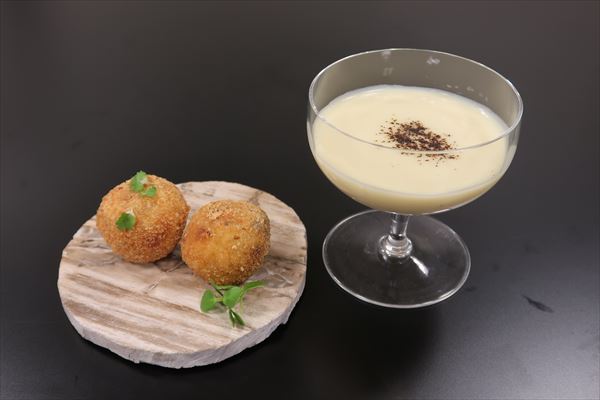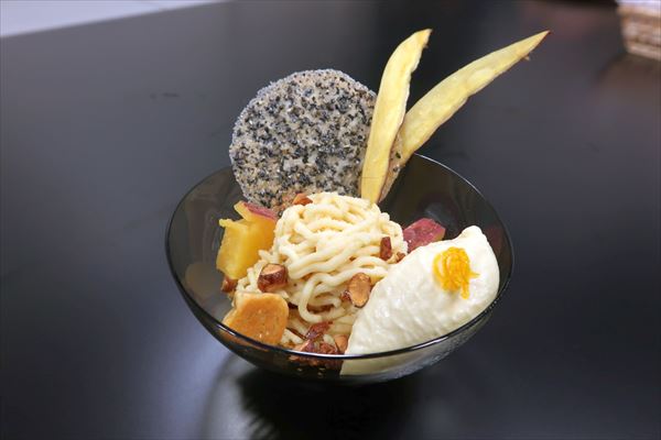 こちらは焼き芋のポタージュです。上に振られている黒いパウダーは、ぜひ紙面でご確認を。