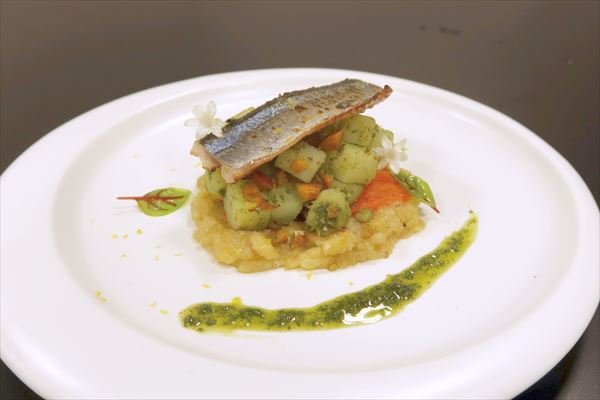 男爵イモをバジルソースで和え、焼きナスのピュレと合わせ、北海道産の炙り秋刀魚と一緒に食べてもらう一皿です。