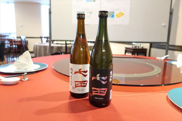 お酒については、佐賀県小城市にある天山酒造の「七田」麦焼酎(佐賀県産二条大麦を使用)と、「七田」純米酒(七割五分磨き 山田錦 扁平精米)という2段構えです。