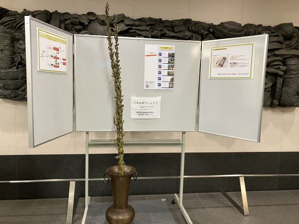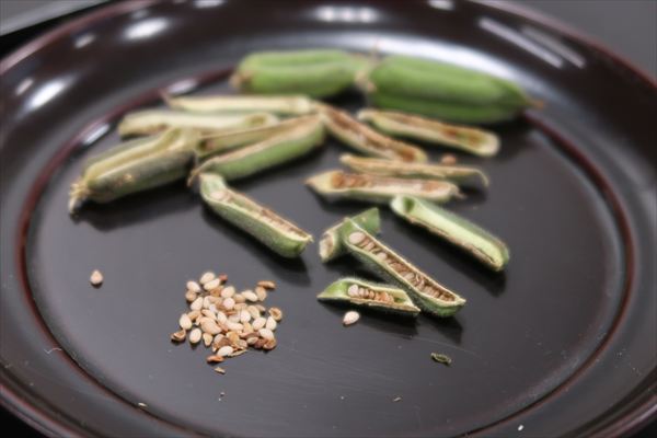 食材の手配はいつも辻調の教材課が担当しているのですが、今回の対談のために和歌山県橋本市からゴマを持ち帰り、対談が終わった後には、辻調本館入ってすぐのところにしばらく掲出しました。前を通る学生たちも興味津々。ゴマはどのように実をつけるのか、どんな製造工程を経由しているのかーーいつも何の気なしに使っているゴマについて、改めて考えてみる良い機会になりました。