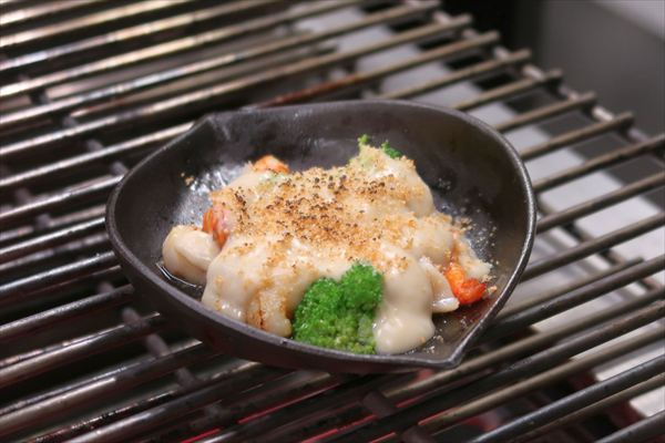3品目は焼き物。「とろめん」を掛けて焼いたグラタン風の一品。ゴマ豆腐をさらに漉してホワイトソースのようにしたものを、とろめんと言うんですって。巽先生も唸る味わい。