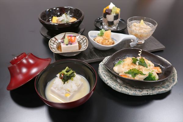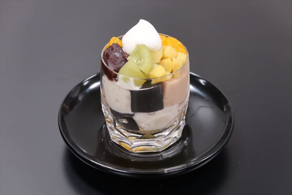 デザートは、黒ゴマ・豆乳・くるみ入りのゴマ豆腐を盛り込んだミニパフェ。