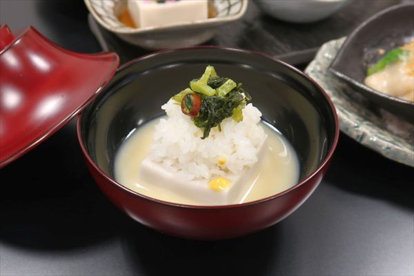 ご飯物は、ゴマ豆腐をご飯で覆って白みそだしをかけた「うずみゴマ豆腐」。