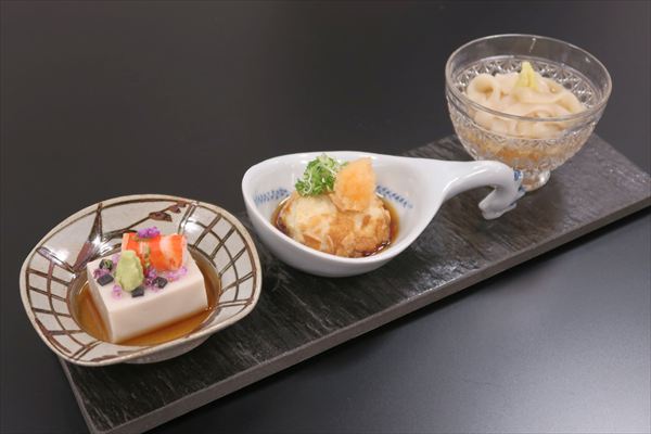 通常のゴマ豆腐と、うにを射込んだ揚げゴマ豆腐、そして葛切り風ゴマ豆腐の3点です。