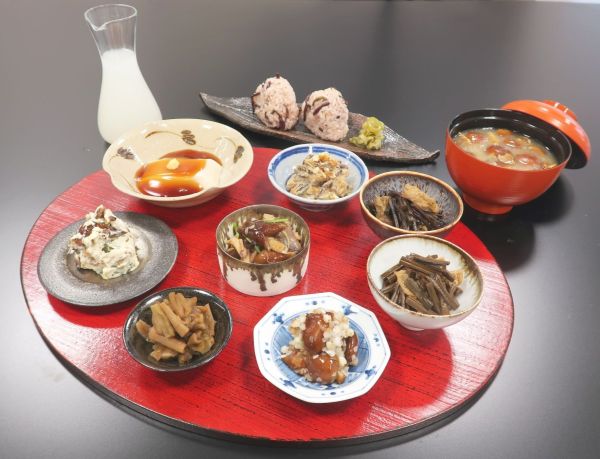 お膳の上:真ん中は三種のキノコ(塩蔵ぶなかのか・塩蔵もたし・干しなめこ)の煎り煮/左上の餡かけごま豆腐から時計回りに、塩蔵わらびと蒟蒻の味噌酢和え、わらびの煎り煮2種(干しわらびと塩蔵わらび)、天然なめこと蕎麦の実の和え物、塩蔵いたどりと薄揚げの煎り煮、塩蔵きのこと生麩の白和え