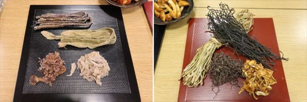 さて、左が塩蔵もしくは乾燥させたキノコと山菜。右は干した山菜です。
