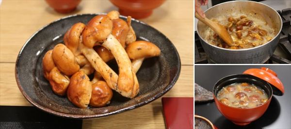 秋といえばキノコの季節。羽黒山で採れたなめこを使い、酒を加えてひたすら混ぜて粘りを引き出し、味噌汁に仕立てました。斎館で供される一品を、松島先生が学び、再現したものです。滋味深く、体にすっと染み入るような味わいです。
