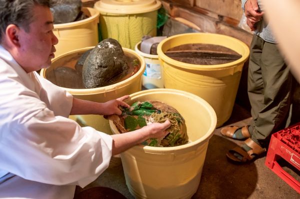 斎館では、山菜を塩漬けや乾燥によって保存食材へと加工します。山菜が採れない季節には、それらを水や湯で戻し、組み合わせを工夫しながら多彩な料理に活かしていきます。だし汁も、昆布や、乾燥芋がら、塩蔵わらび、乾燥きのこ類などから引いて、ブレンドして用いるそう。