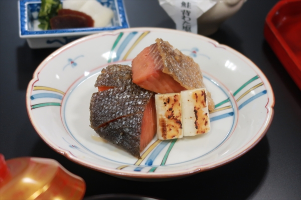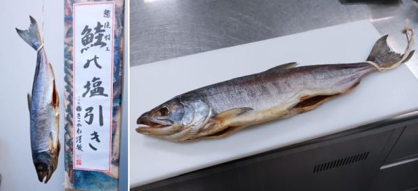 塩引きサケ、みなさんご存じでしょうか? 強く塩を当てて、ほどよく塩を抜いてから、日本海沿岸特有の寒風にさらしながら一週間から数週間程度熟成させたものです。塩気もうまみも絶妙! 対談現場は関西人ばかりなので、一つ一つに驚きながら、かみしめるように味わっていました。