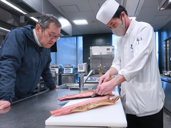 塩引きサケをおろす長谷川先生と、興味津々の教材課の進藤先生。