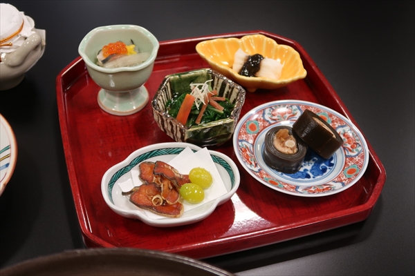 中央が鮭の酒びたし、左上から時計回りに氷頭なます、鮭の血合いの塩辛をかけた長芋そうめん、軟らかく炊いた中骨(!)の昆布巻き、尾の付け根の薄切りを揚げた鮭の尾せんべい〈おせんべい〉です。