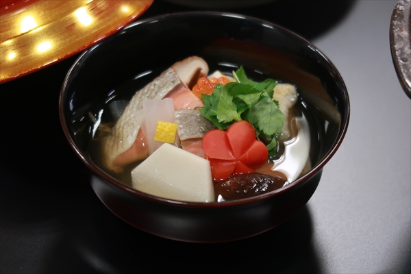 正月なので、塩引きサケとイクラを加えた親子雑煮が登場。すまし仕立てで、サケのうまみがじんわりと。