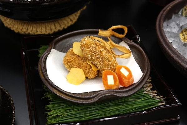 揚げ物は、牡蠣に、お「かき」衣をまぶして、柿(かき)バターを添えて...これは、先生遊んでいますね(笑)