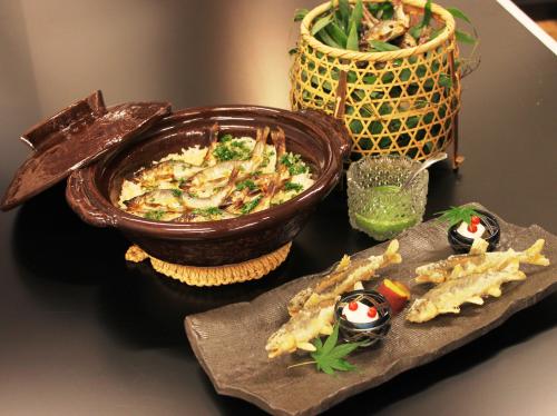 料理は「鮎ご飯」「稚鮎の天ぷら」「鮎の塩焼き」