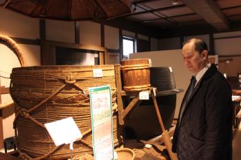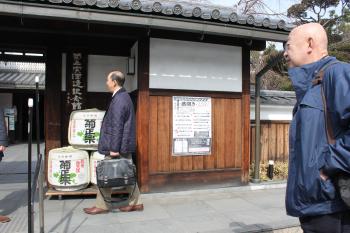 大引先生も興味深い様子。菊正宗は「きもと」作りが特徴の蔵元で、その工程をじっくり見学したようです。