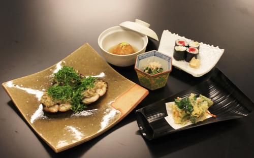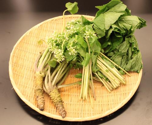 料理は手前から時計まわりに「葉ワサビのかき揚げ」、「サワラのワサビ粕漬け」、「蓮根まんじゅう ワサビあん」、「お浸し」、「細巻き」
