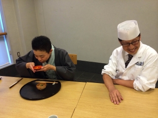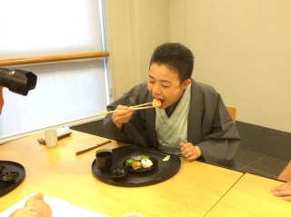 「お寿司を食べるコツは、ネタが最初に舌に触れるように口に運ぶんですよ~」