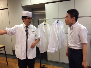 取材会場にやってきた吉坊さんに、いきなり白衣を着るように促す山下先生。