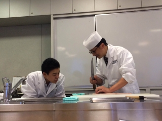 山下先生が包丁の重さを生かして皮ギリギリまで・・と説明しながら実践。