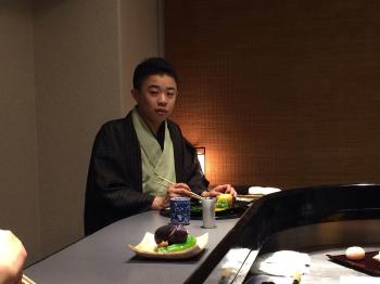 安場先生が目の前で合鴨の燻製を切り分け、