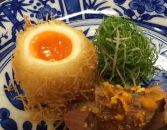 「卵の黄身に付けながら食べてください。」と安場先生に促されて、
