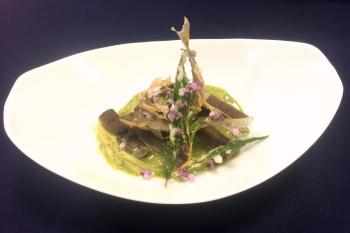 それでは、初登場太田先生の1品目。「鮎素揚げ筮竹たで味噌敷き」。