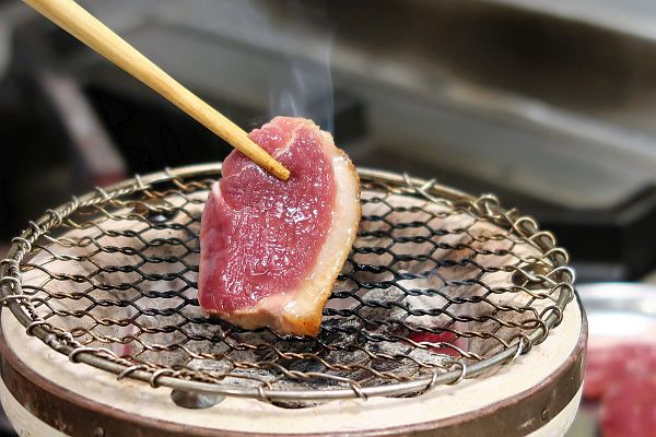 鴨は脂身にしっかり焼き色をつけると、コクが増してぐっとおいしくなるとのこと。こちらも七輪でジュージューと。
