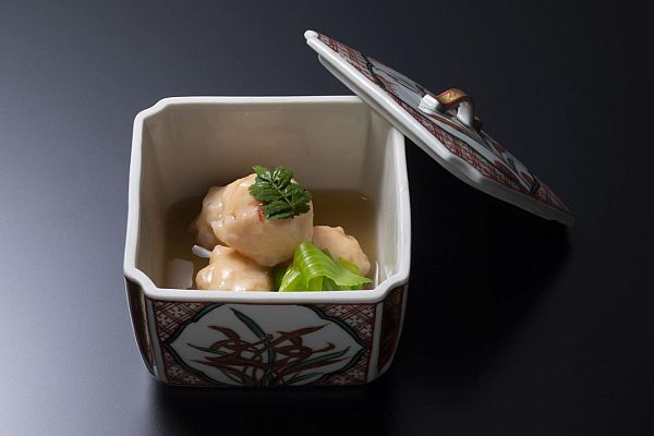こちらの写真は、カメラマンの東谷幸一さんの撮影によるものです。いつもありがとうございます!料理は「車海老と烏賊のつみれ煮」。海老+烏賊のすり身と粗刻みで作ったつみれを、ほんのり甘い煮汁に入れて火を通し、葛あんでまとめました。