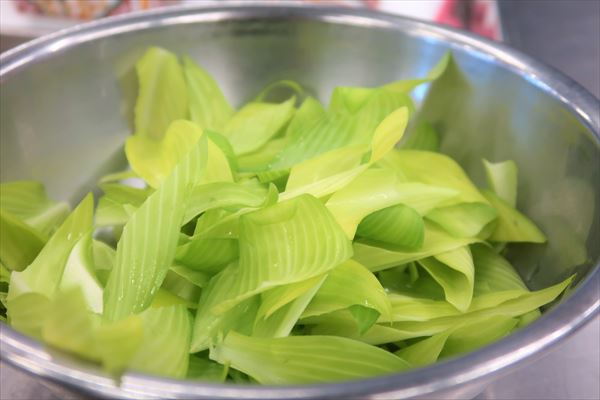 小川先生が持っているのは、東北地方で古くから知られる春の山菜「ウルイ」。クセがなく、サクッとした食感と少しだけぬめりを持つ食材です。初めて知ったのですが、本当にきれいな姿ですね。