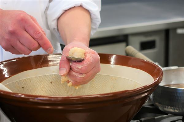 今回は手から絞り出し、スプーンでクルンとすくい取って煮汁へ入れることで、一口大のきれいな丸い形にしています。