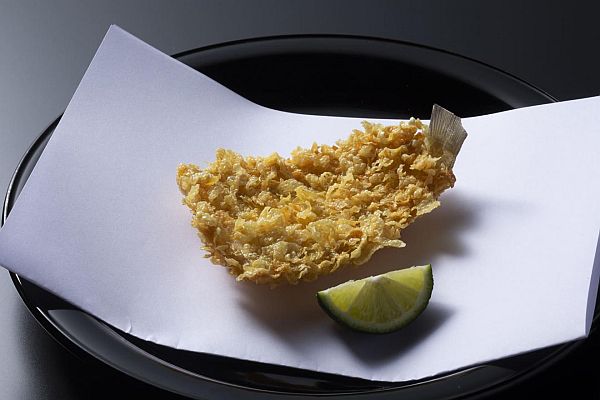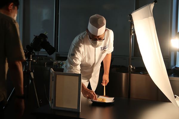 上記の写真は、カメラマンの東谷幸一さんの撮影によるものです。今回の料理は、砕いた湯葉を衣にした東寺揚げ。香ばしく、サクサクに仕上げました。