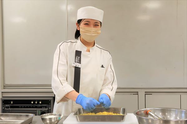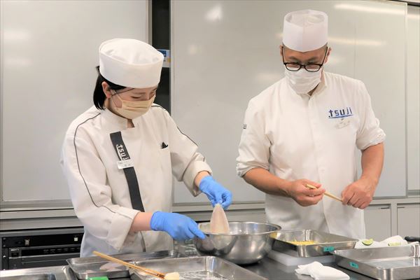 料理担当は、日本料理の小川健先生(辻調理師専門学校)です。助手は、TA(ティーチングアシスタント)の前川明織さんが務めました。