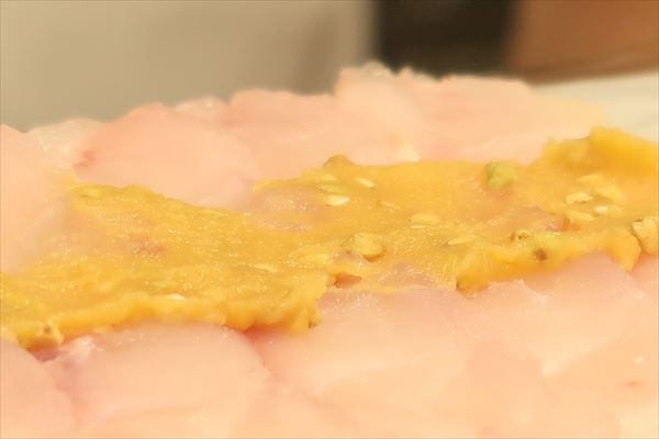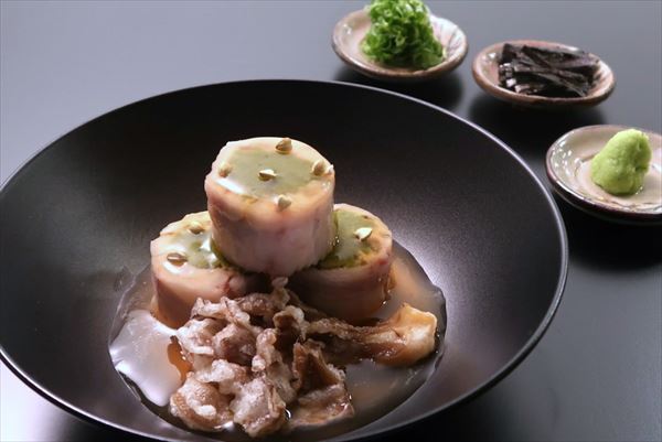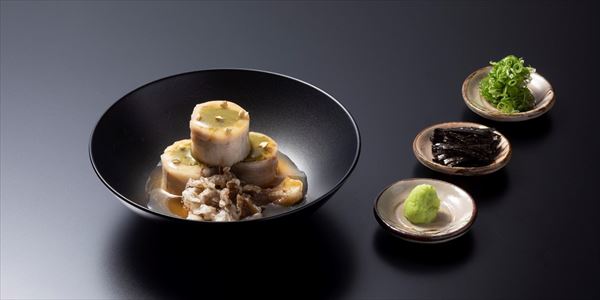 茶蕎麦を包むのは甘鯛ですが、あくまで茶蕎麦を生かすため、甘鯛は控えめな厚みでクルン。